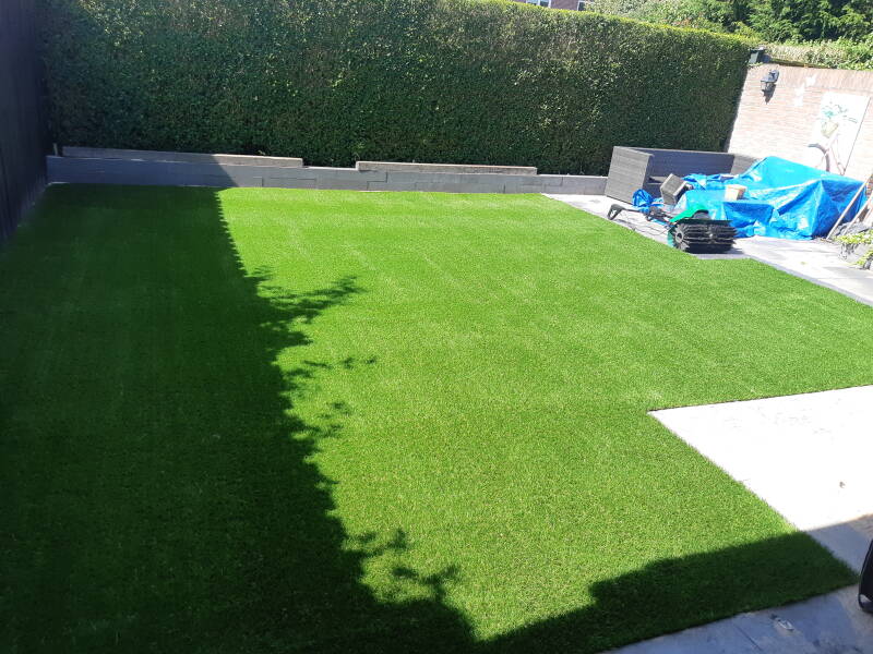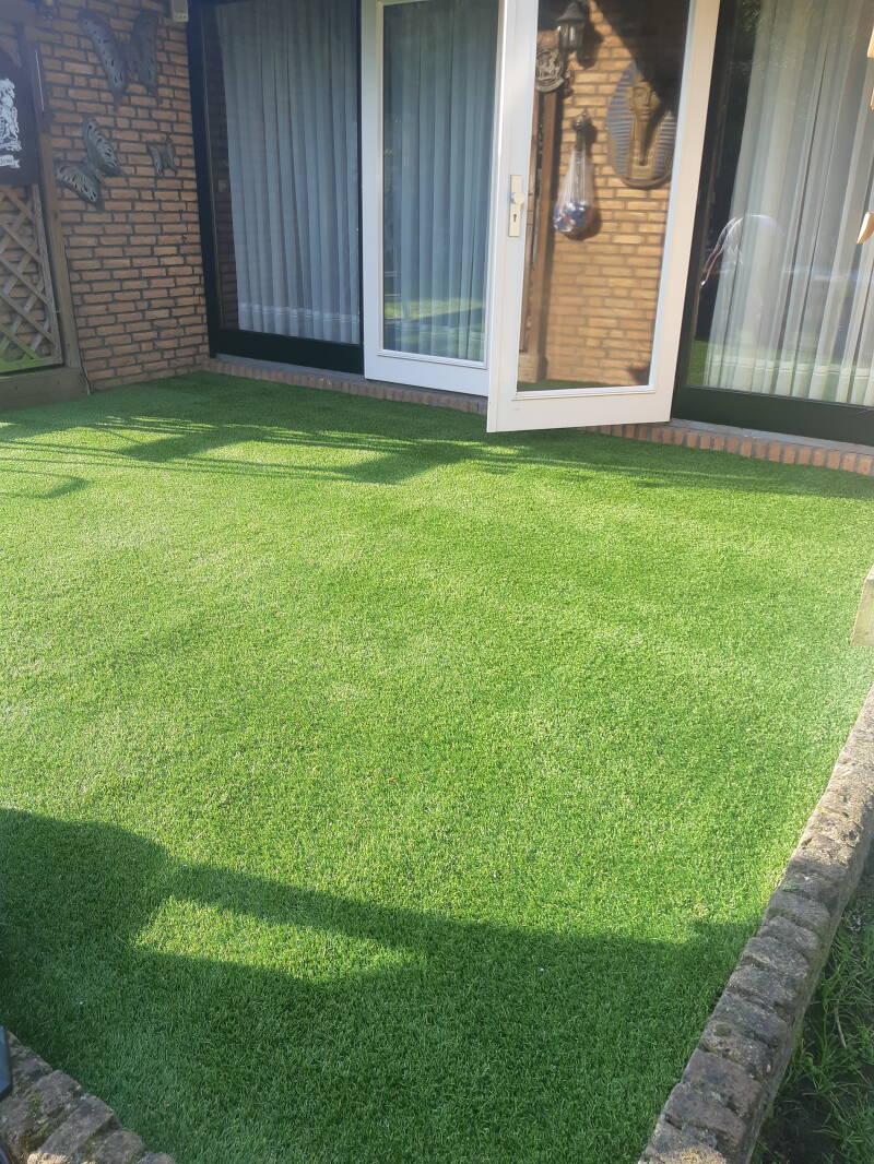 Op de foto hierboven hebben wij kunstgras aangelegd. de klant heeft zelf de kantopsluitingen geplaatst en het grondwerk gedaan.