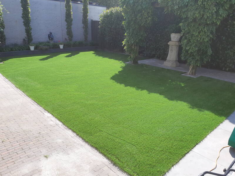 Op de foto hierboven hebben wij het kunstgras aangelegd over het bestaande terras van straatstenen. Wel hebben wij de bestaande opsluitbanden en randen gerepareerd, zodat de overgangen van het gras naar de bestrating gewoon klopt.