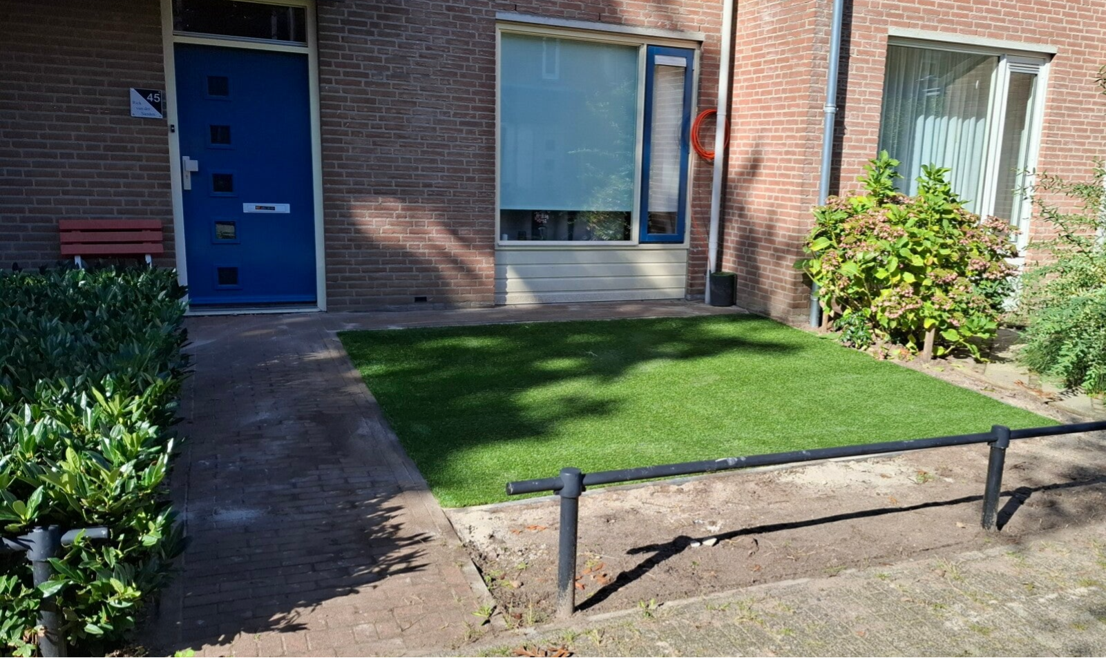 Op de foto hierboven hebben wij alles gedaan, van het grondwerk tot het aanleggen van het kunstgras en ook de bestrating hebben wij gerepareerd, deze was verzakt.