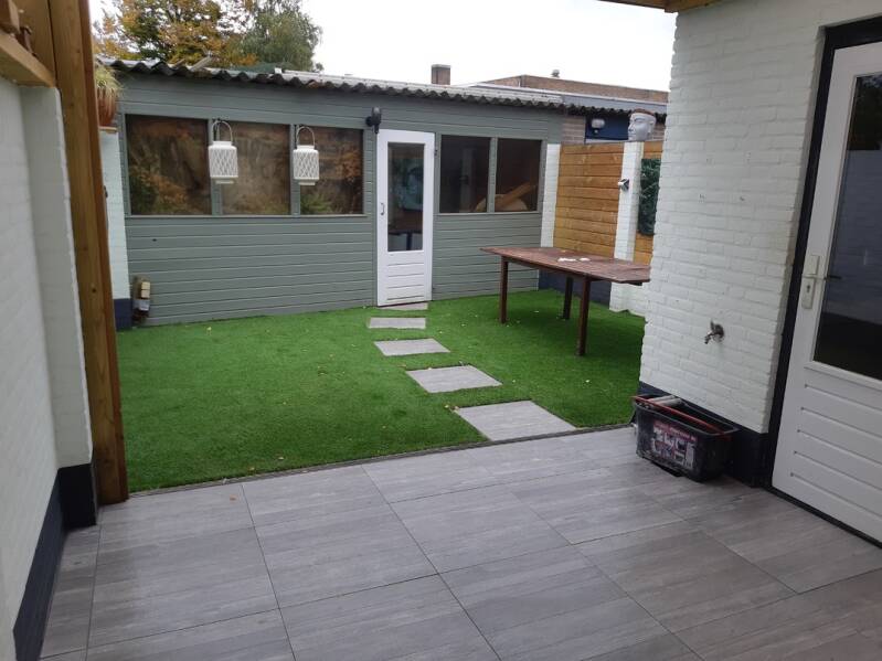 Op de foto hierboven hebben wij alles gedaan, van het grondwerk tot het aanleggen van het kunstgras en het aanbrengen van de tegels.