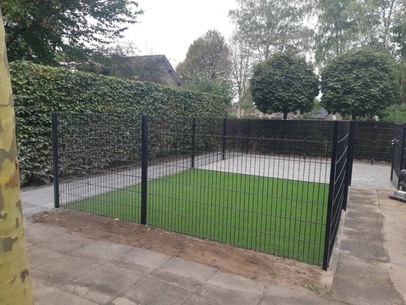 Op de foto hierboven hebben wij de oude kunstgrasmat verwijderd, en ondergrond aangepast naar de goede samenstelling. daarna een mooie nieuwe kunstgrasmat aangelegd. ook de bestrating hebben wij aangepast.
